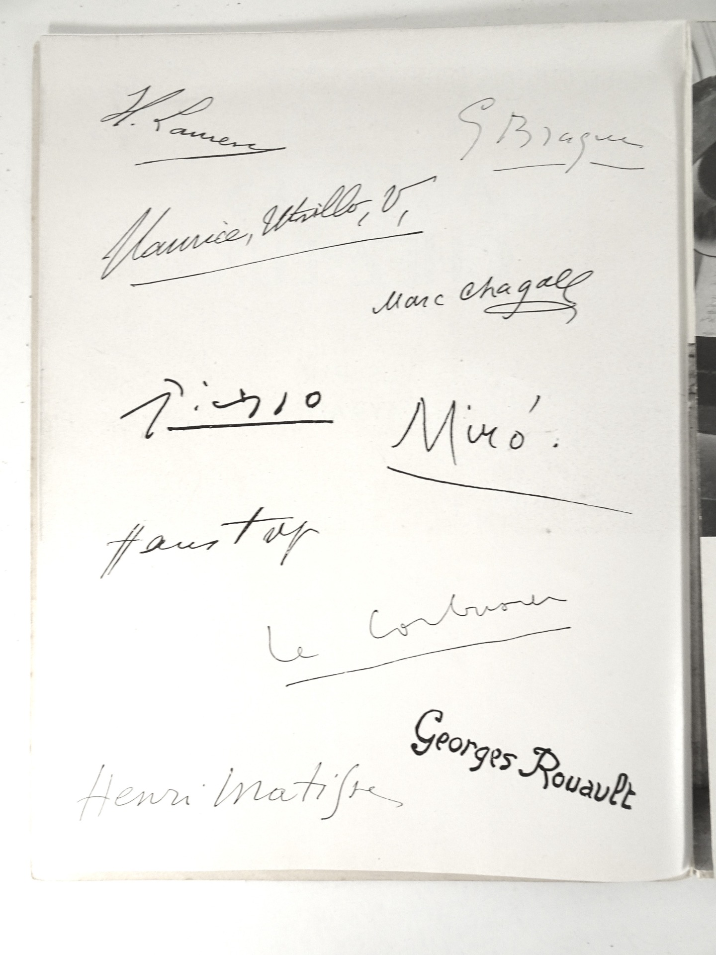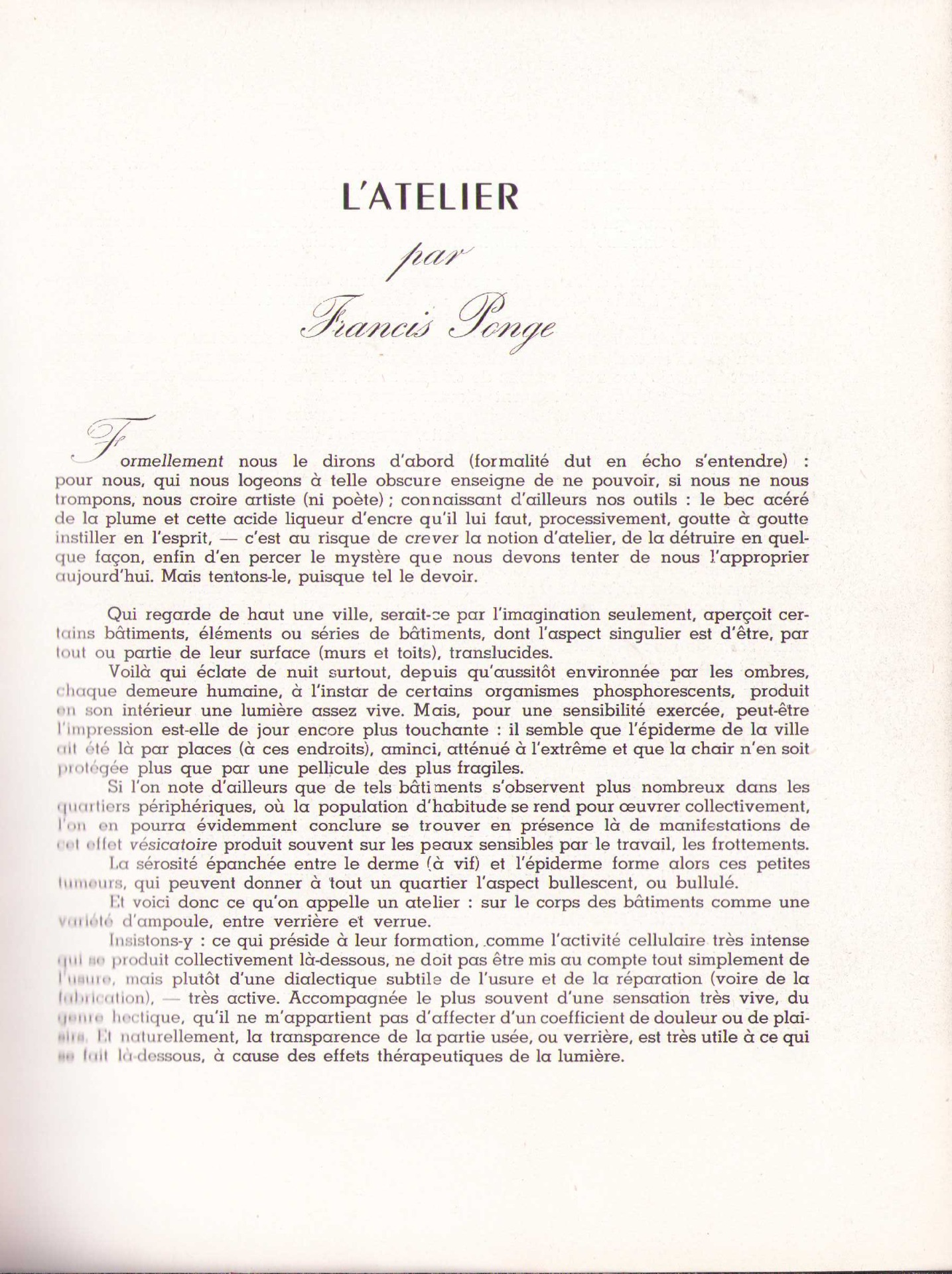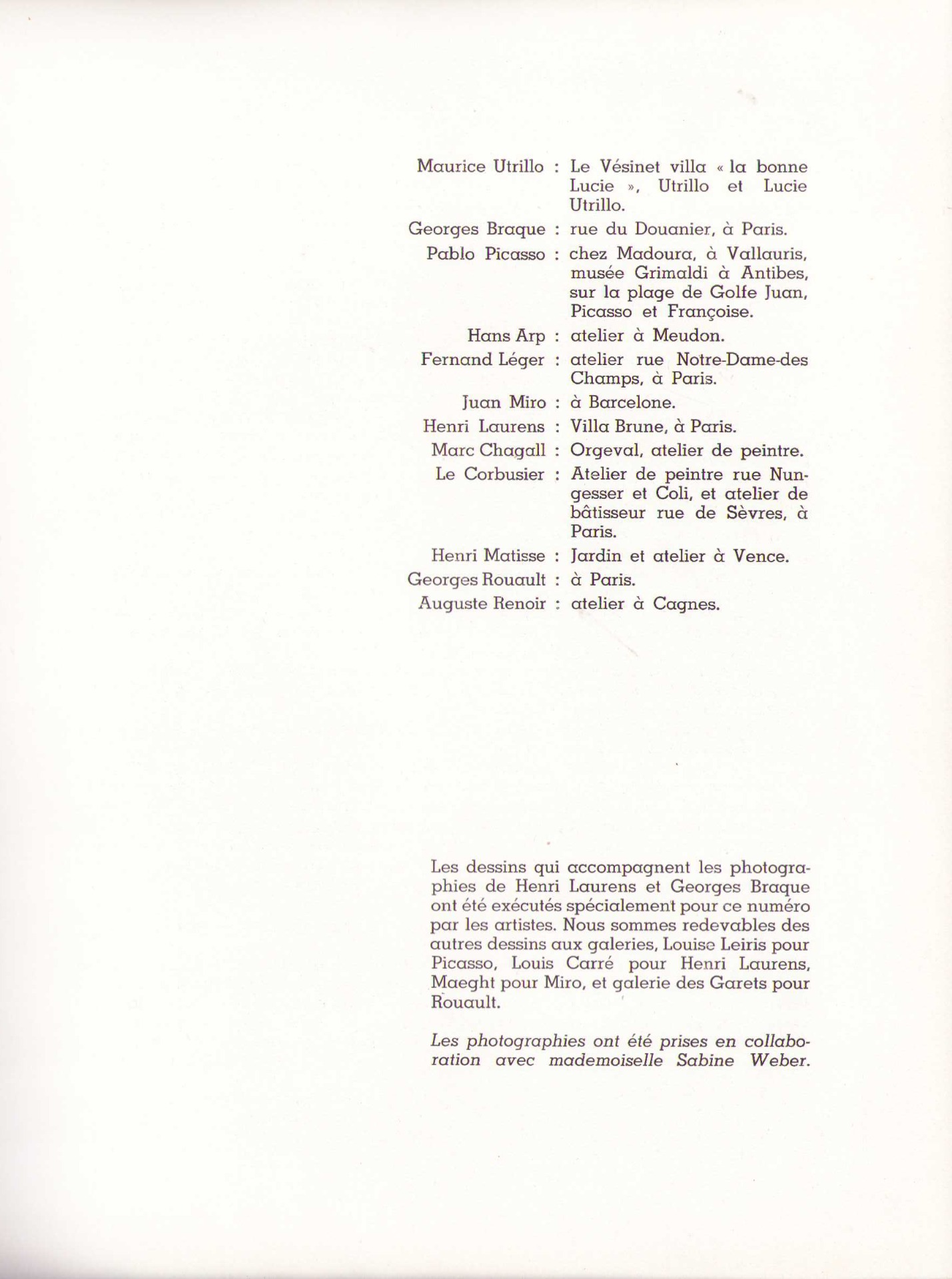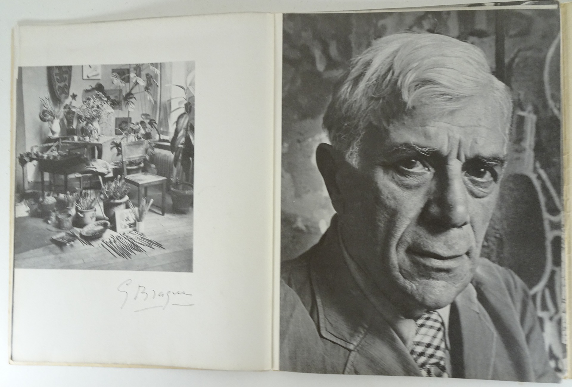Edition originale de ce recueil de photographie de Willy Maywald, portraits et vues d'ateliers de Maurice Utrillo, Georges Braque, Pablo Picasso, Hans Arp, Fernand Léger, Joan Miro, Henri Laurens, Marc Chagall, Le Corbusier, Henri Matisse, Georges Rouault. Postface de Francis Ponge titré L'Atelier. Illustrations des artistes en marges des clichés.