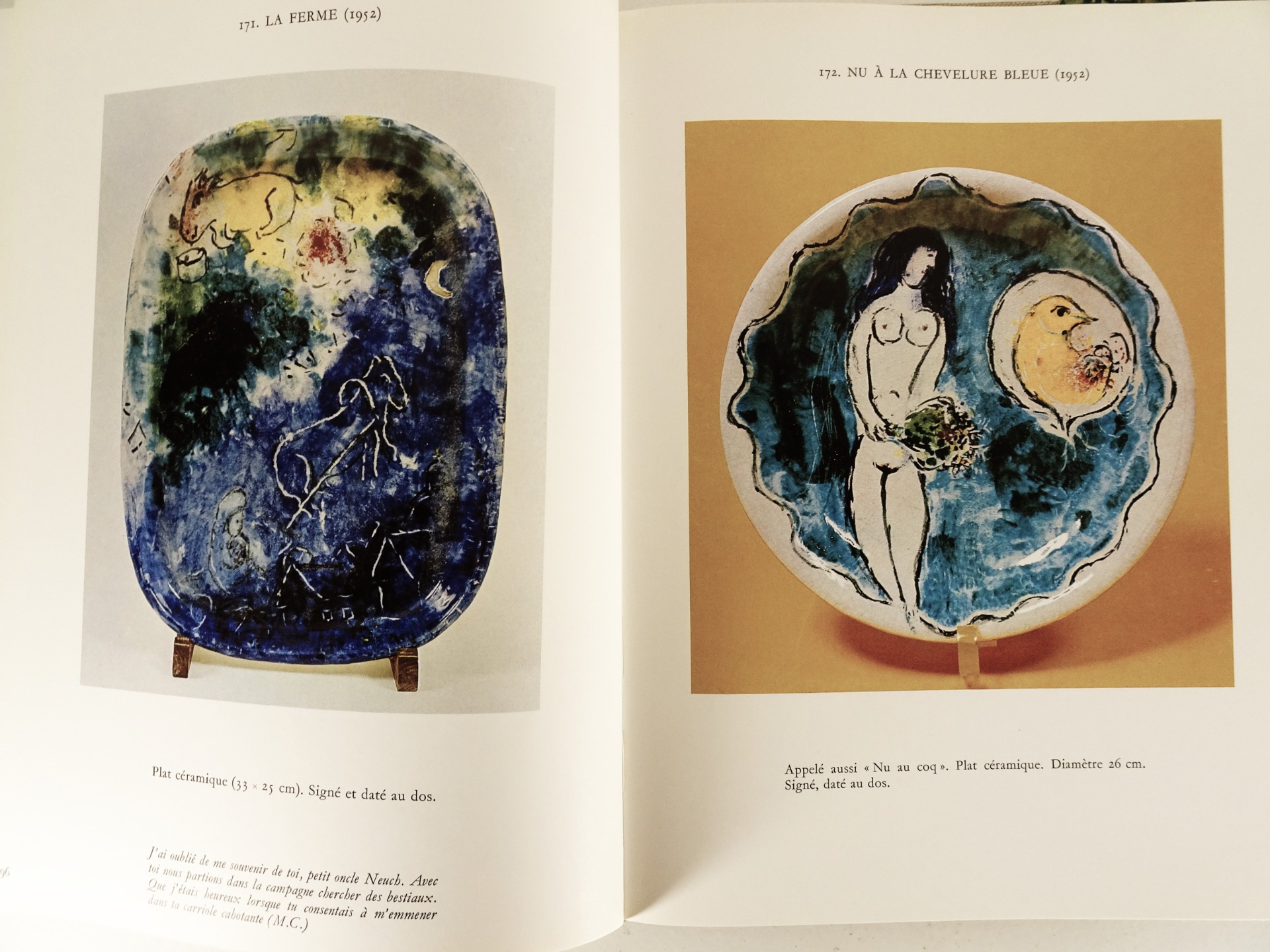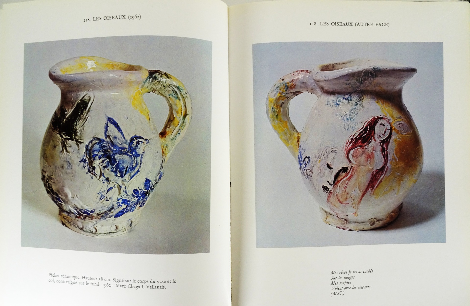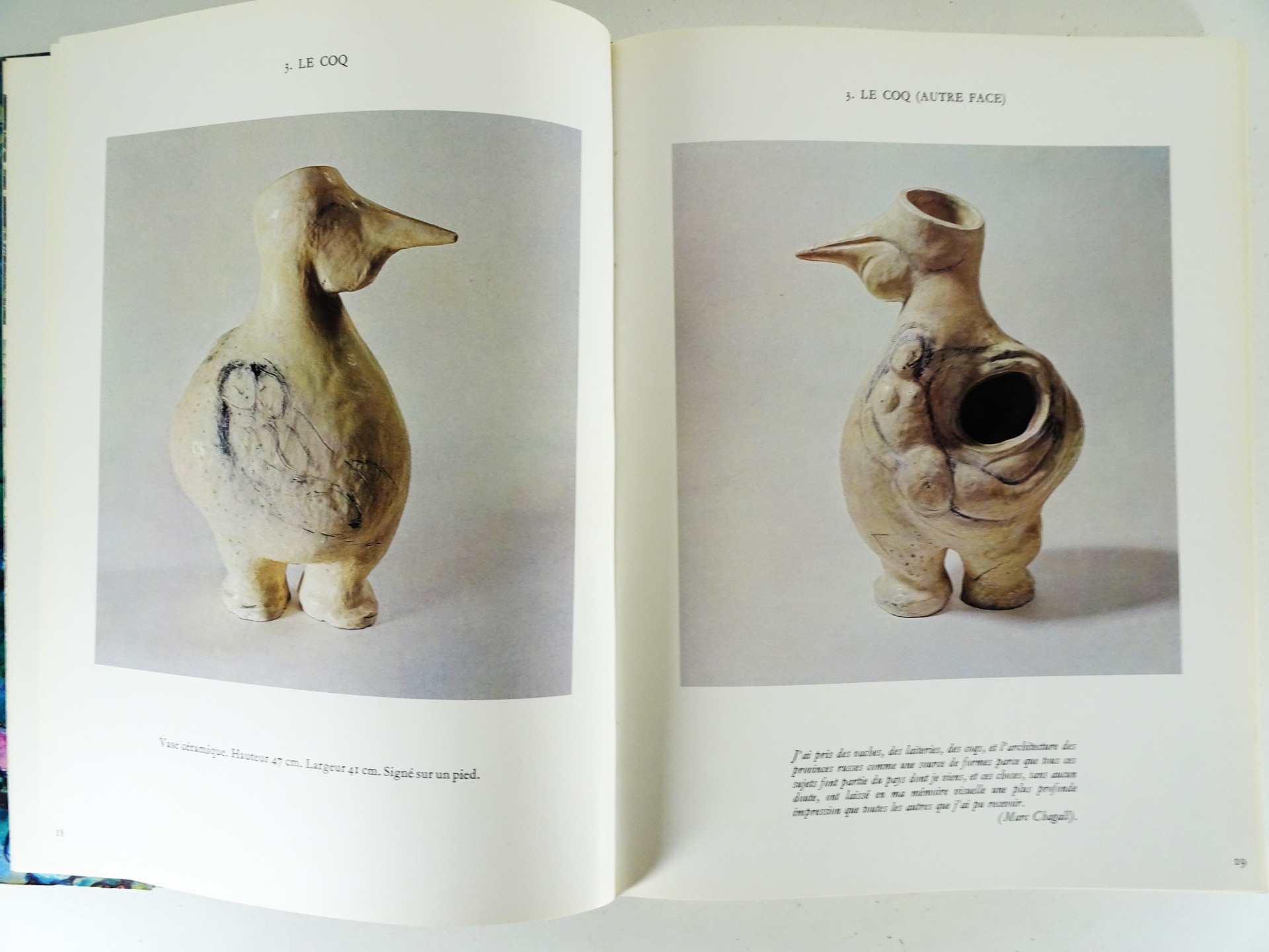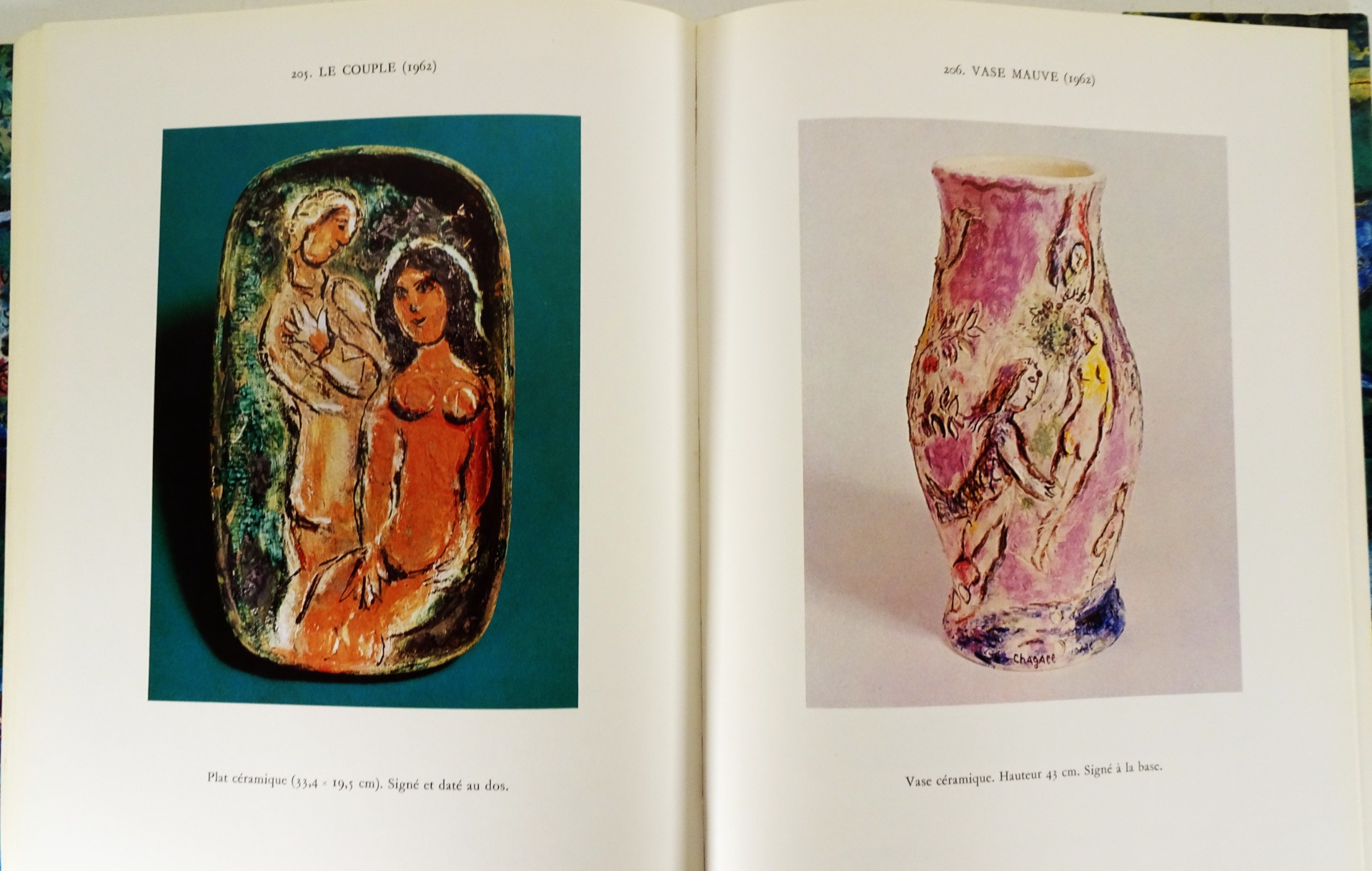 Imprimée et reliée à Lausanne, cette monographie de qualité aborde un aspect moins connu de l'oeuvre de l'artiste. « La céramique occupe une place très importante, quoique assez secrète, dans l'œuvre de Chagall. Ces pièces uniques, dont nous présentons aujourd'hui le catalogue, ont rarement été exposées, et peu d'amateurs ont eu le privilège de les admirer. »