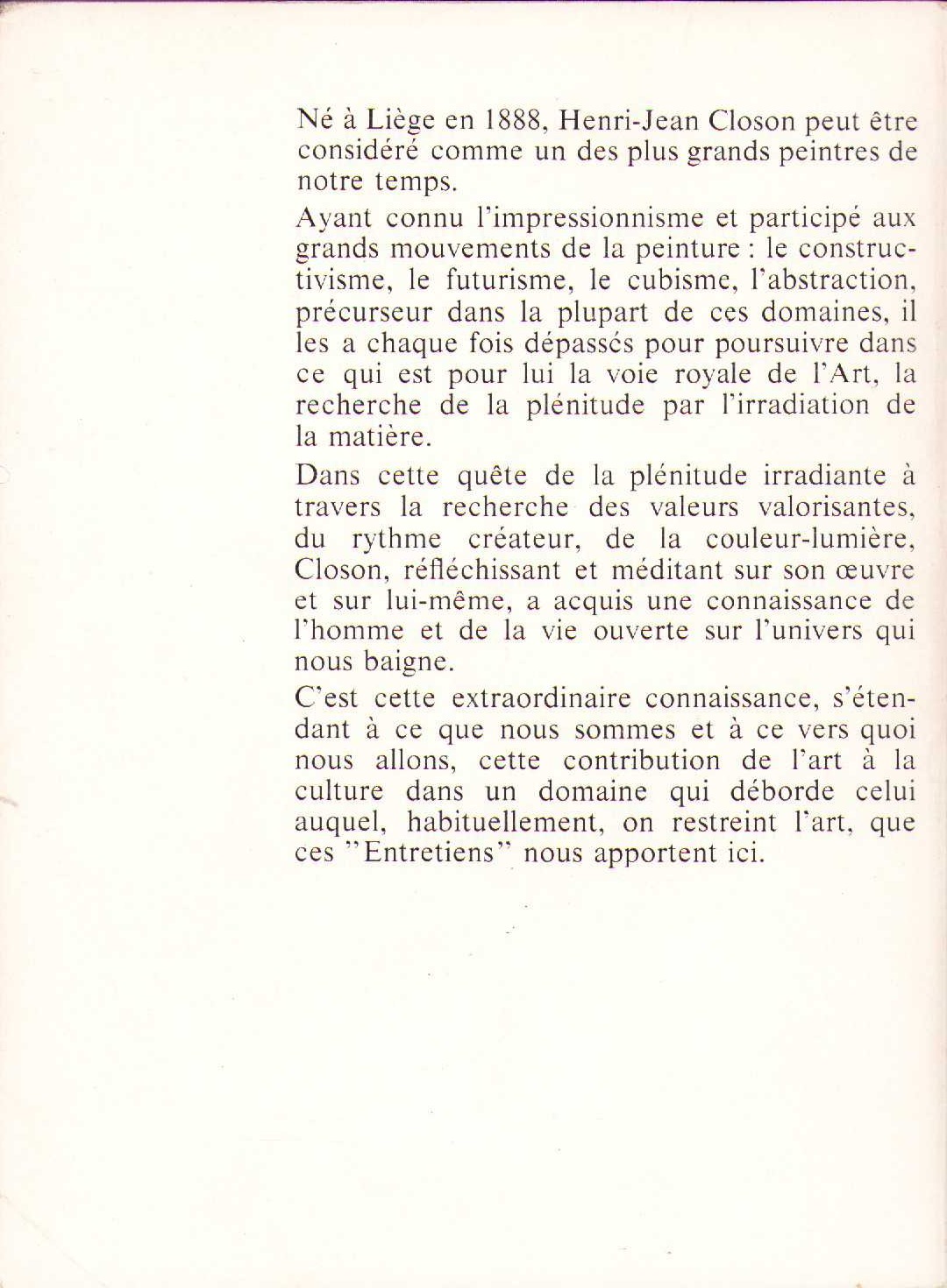 Henri-Jean Closon (Liège, 1er mars 1888 - Paris 14e, 9 juillet 1975 est un pionnier de l'abstraction belge, connu pour ses compositions vibrantes de couleurs. Ce Liégeois part à la conquête de Paris au lendemain de la première guerre mondiale, précédant de quelques années d'autres artistes belges tels que Vantongerloo, Seuphor, Engel-Pak ou Magritte.