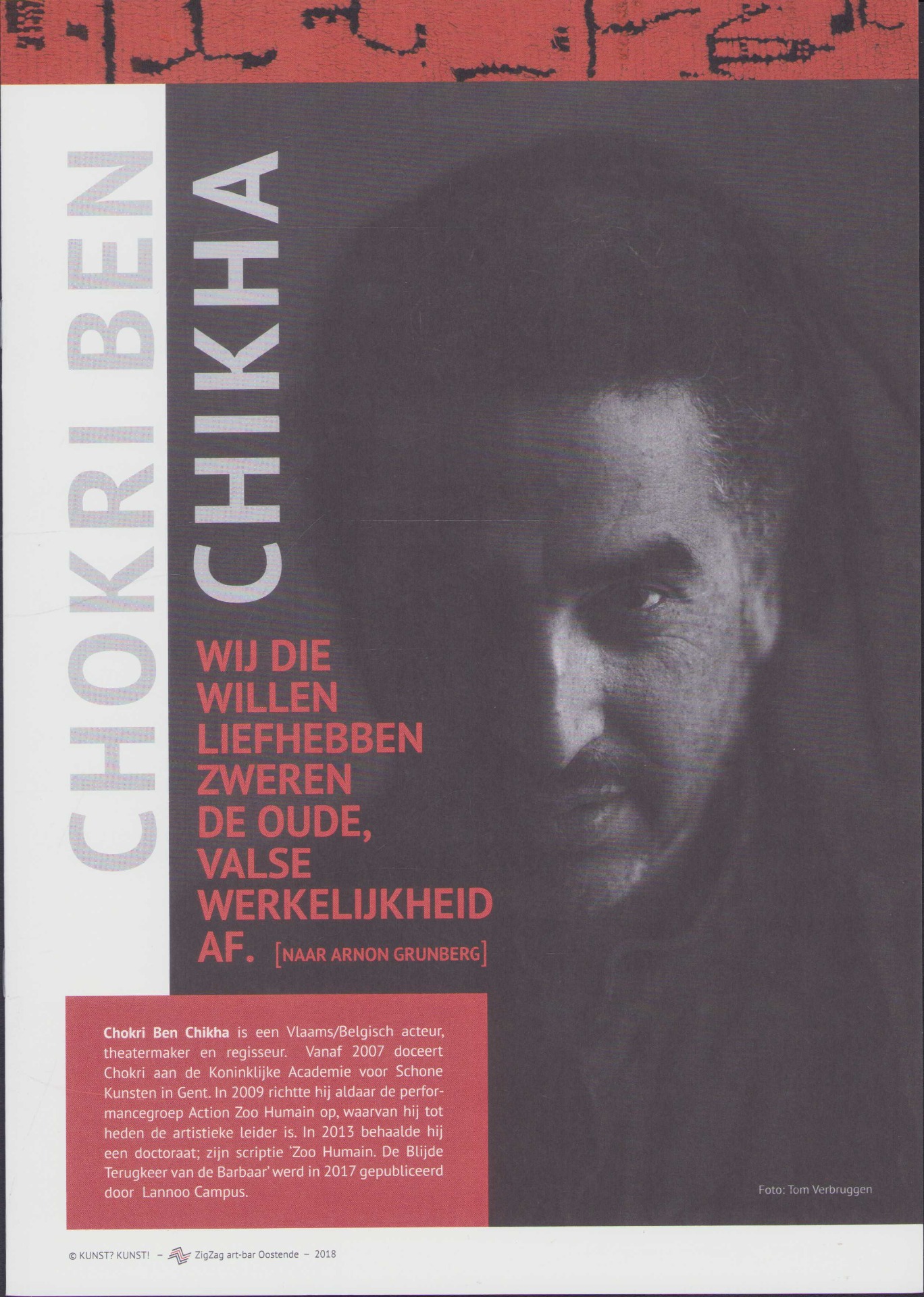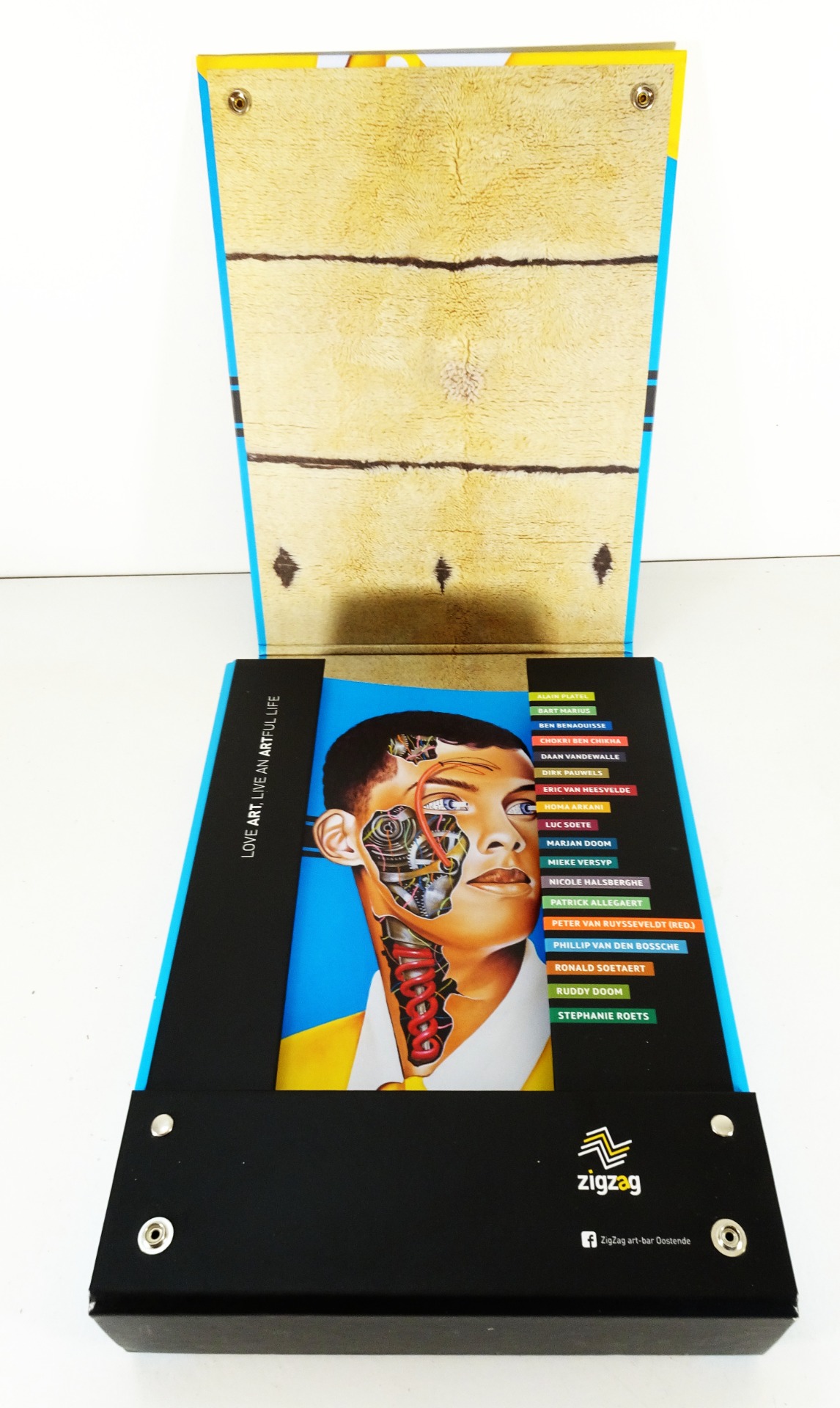 Kunstmap/cassette - weergave van een kunstproject in 18 bijdragen (onder de vorm van boekjes o.a. van Alain Platel, Patrick Allegaert, Ben Benaouisse, Chokri Ben Chikha, Marjan Doom, Peter Verhelst, e.a.) en 32 kunstfoto's