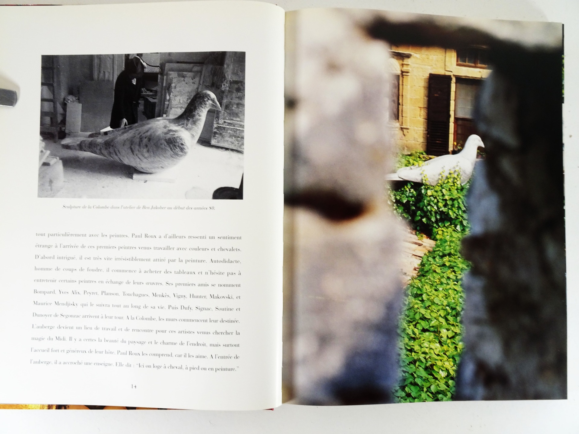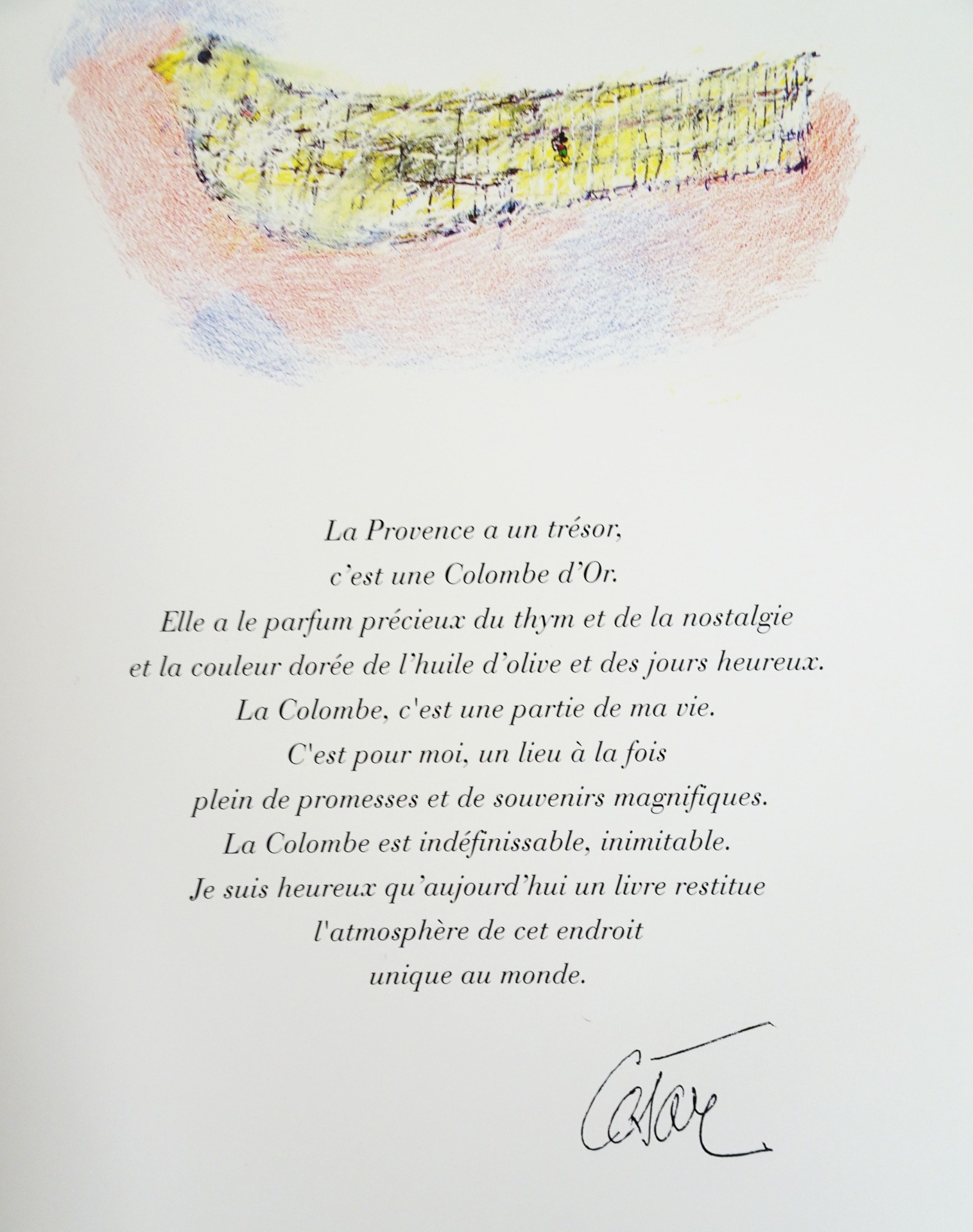 "Connue dans le monde entier, l'Auberge de la Colombe d'Or est un lieu privilégié qui associe la douceur de vivre en Provence à une étonnante collection particulière d'art moderne. Au fil des décennies, la famille Roux qui garde le secret de cet art de vivre inégalé, a vu son destin mêlé à des êtres d'exception tels que Pablo Picasso, Jacques Prévert, Yves Montand ou James Baldwin. Habitués de ce très bel endroit, Matisse, Braque, Léger, Calder, César et bien d'autres, y ont laissé des oeuvres magnifiques qui font désormais partie de ce cadre unique." M. Assouline.