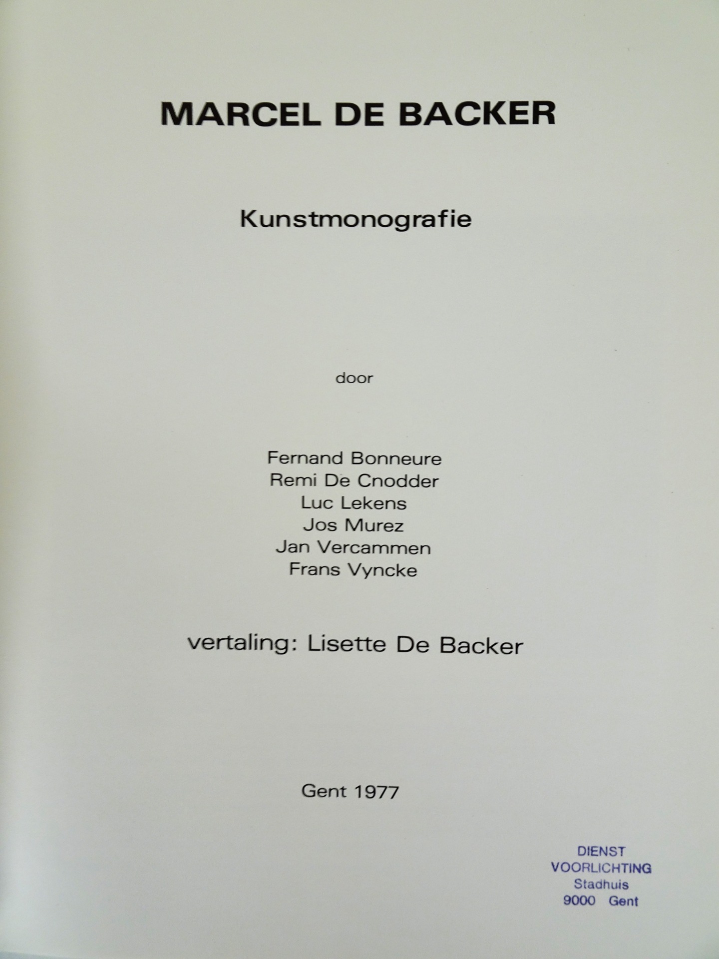 3) Marcel De Backer Kunstmonografie - door o.a. Fernand Bonneuer - Gent 1977 - Softcover met flappen - 27 x 21,5 - 77 p. - staat: goed - stempel en etiket van Dienst Voorlichting Stad Gent