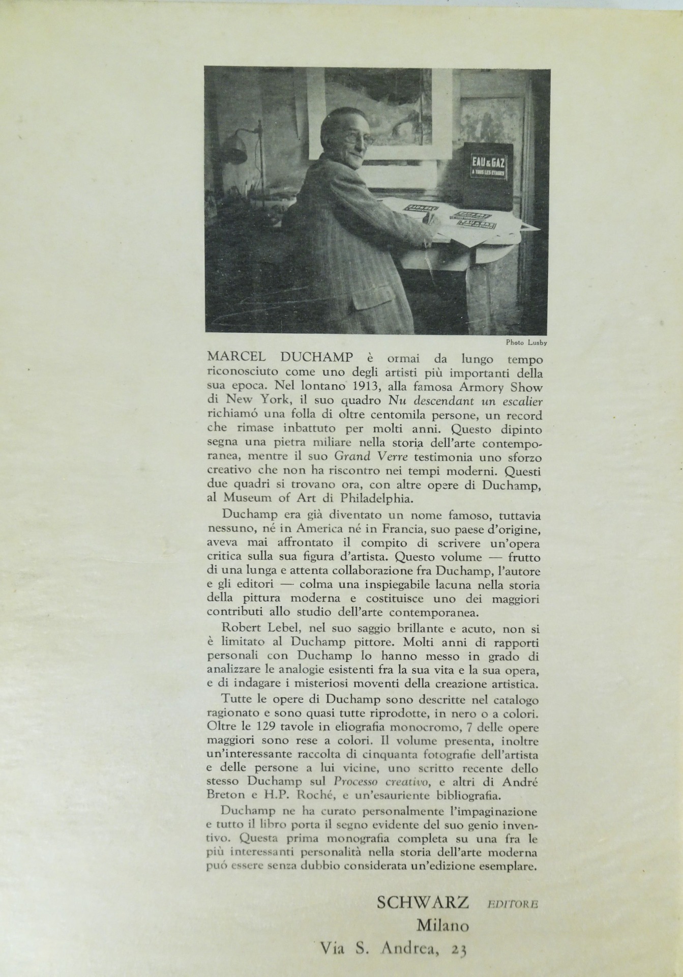 Ce livre, le premier publié sur Marcel Duchamp, est une initiation à l'oeuvre et à la personnalité de l'artiste. A travers Duchamp, l'auteur met également en perspective la situation du peintre dans la société contemporaine d'alors, et analyse les mobiles de l'activité créatrice. Un cahier de douze pages regroupant les correspondances échangées entre l'artiste et l'auteur complète cet ouvrage.