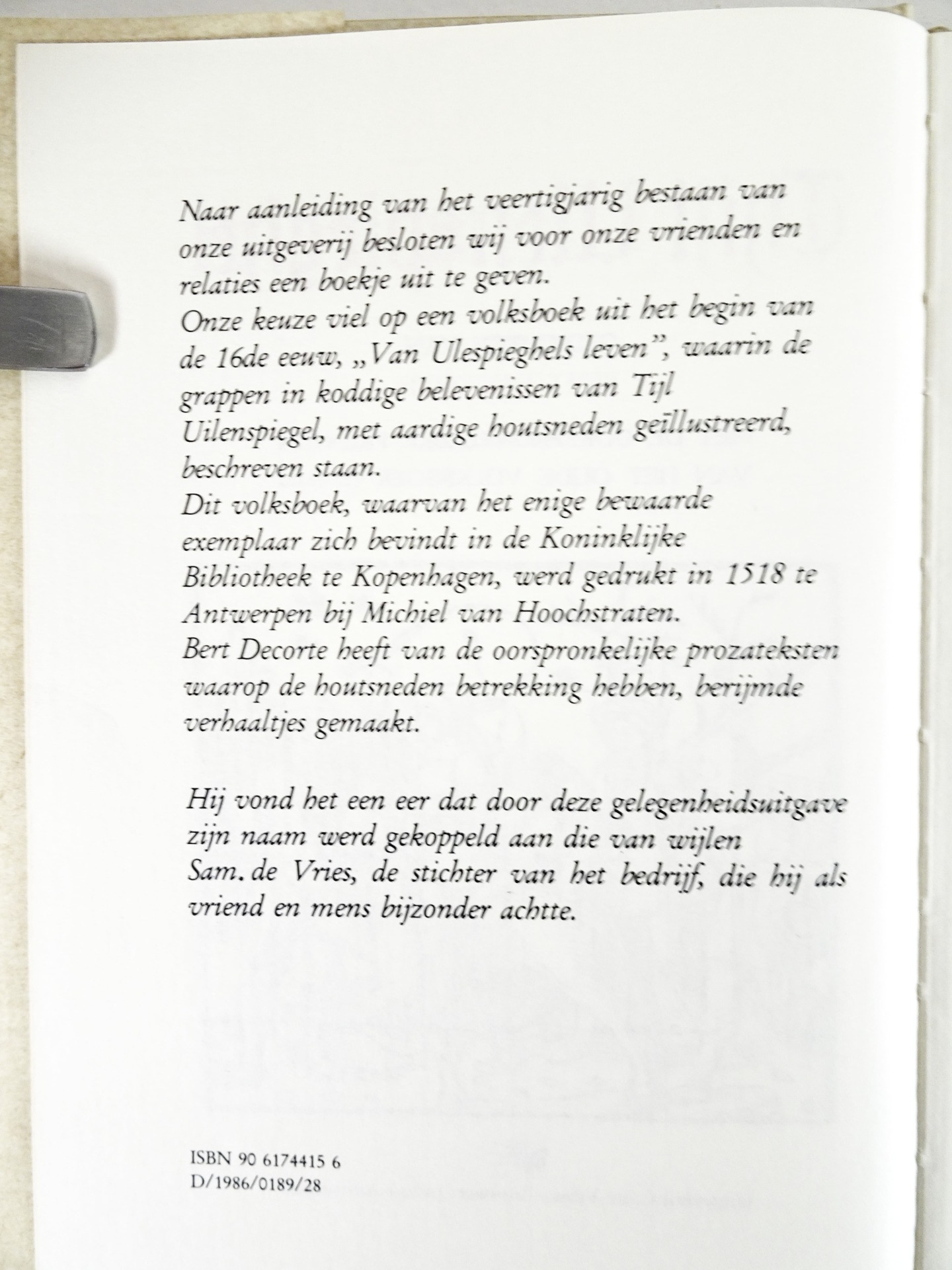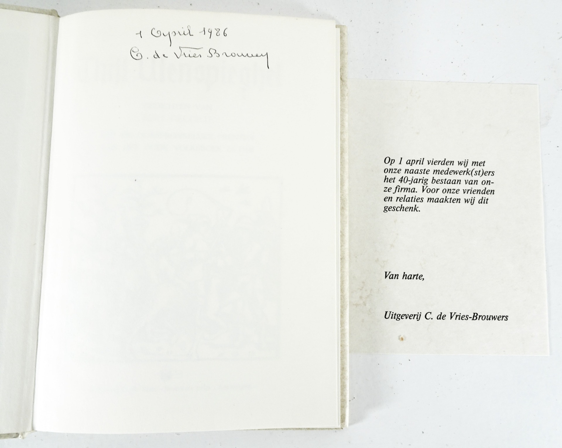 Relatiegeschenk n.a.v. 40 jaar uitgeverij C. de Vries-Brouwers - Antwerpen 1 april 1986 - gesigneerd door (mevr.) C. de Vries-Brouwers - beperkte oplage